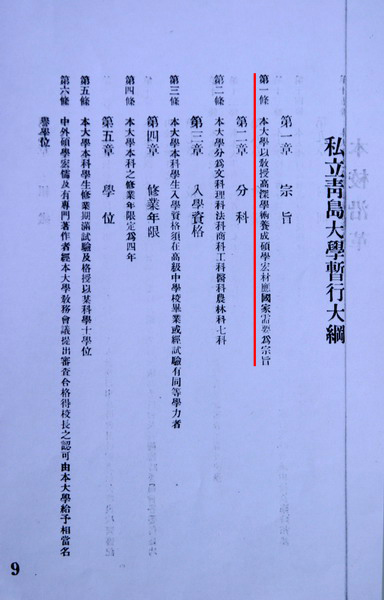 中国海洋大学的前身——私立青岛大学创建于1924年,是国人在齐鲁大地上创办的第一所本科起点的现代大学。学校实行董事会制,胶澳商埠督办高恩洪兼任校长,聘任国内学界名流梁启超、蔡元培、张伯苓、黄炎培等为名誉董事。学校开宗明义,以“教授高深学术,养成硕学宏材,应国家需要”为宗旨。